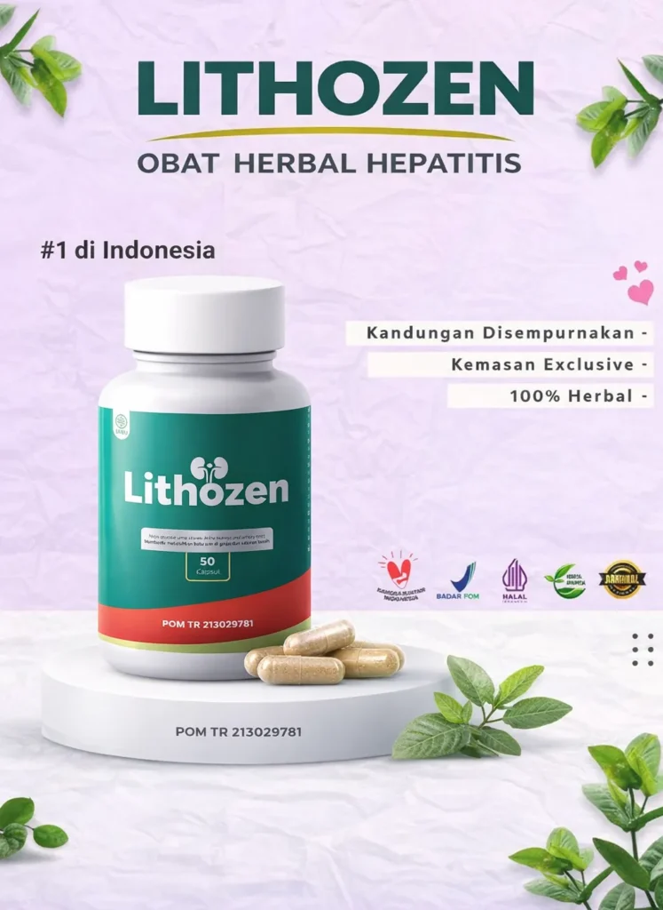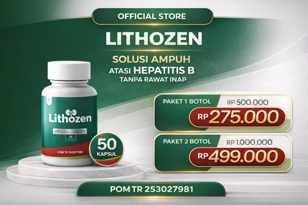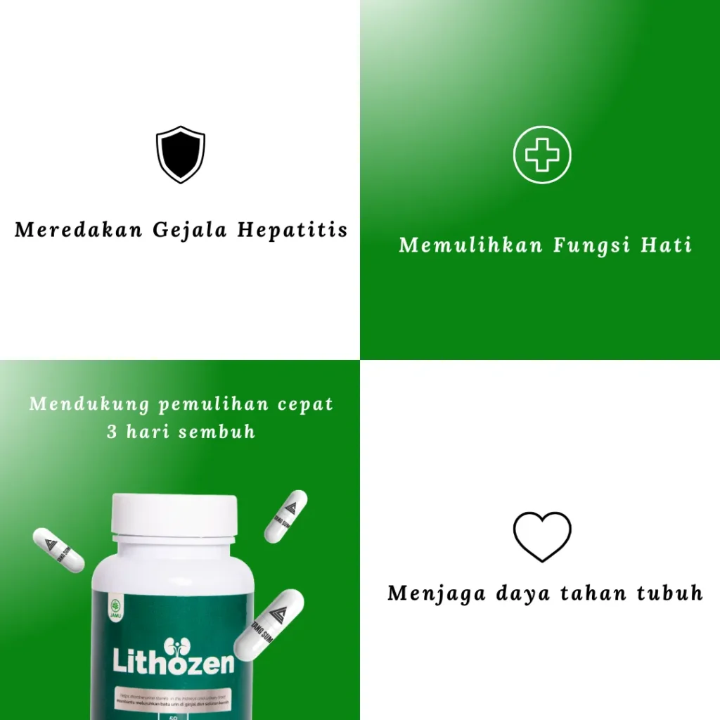 Lithozen adalah suplemen herbal yang membantu mendukung kesehatan hati dan meringankan gejala Hepatitis B secara alami. Diformulasikan dari bahan herbal pilihan, Lithozen dipercaya dapat membantu mendukung fungsi hati, meredakan peradangan ringan akibat infeksi virus Hepatitis B, meningkatkan energi, serta membantu tubuh terasa lebih nyaman.